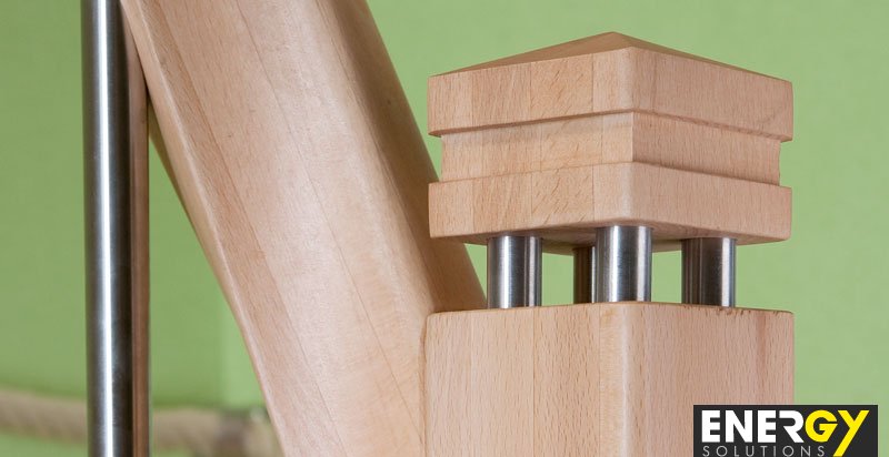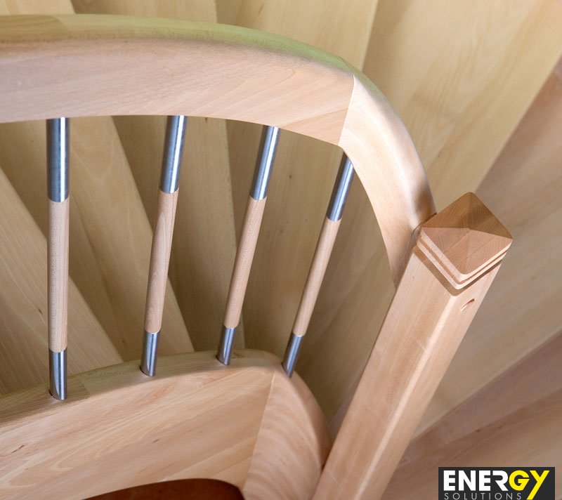 Beech stairs with railing: wood + stainless steel.